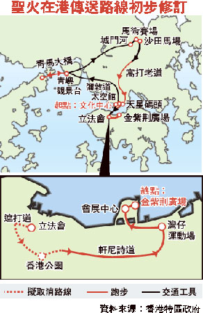 周一凌晨警方的火炬跑路線測(cè)試后,發(fā)現(xiàn)有“超時(shí)”情況,加上為減低火炬被搶或弄熄的風(fēng)險(xiǎn),有關(guān)單位計(jì)劃縮短某些不必要的行程,例如原定在港島的傳遞路線,是由立法會(huì)開(kāi)始,然后經(jīng)遮打道、香港公園、軒尼詩(shī)道再去灣仔,但有關(guān)單位有意刪減兜入香港公園的地段。消息指出,香港火炬手仍會(huì)維持120人,但各人運(yùn)送路程可能略作調(diào)整。