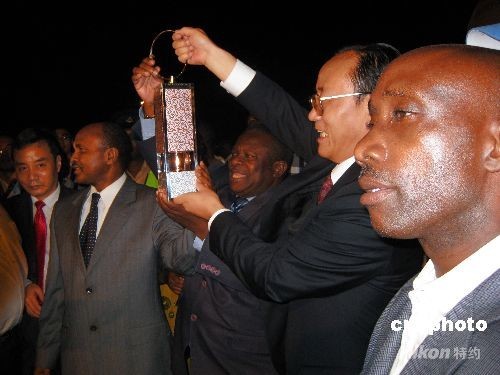 北京奧運(yùn)圣火抵達(dá)時(shí)天色已黑,但坦桑尼亞當(dāng)?shù)孛癖娪脴O富非洲特色的歌舞迎接圣火的到來(lái),場(chǎng)面甚是熱鬧。據(jù)中國(guó)駐坦桑尼亞大使館工作人員介紹,圣火抵達(dá)前一個(gè)小時(shí),當(dāng)?shù)孛癖娋烷_始在停機(jī)坪附近跳舞、唱歌,愉悅的心情寫在他們的臉上。