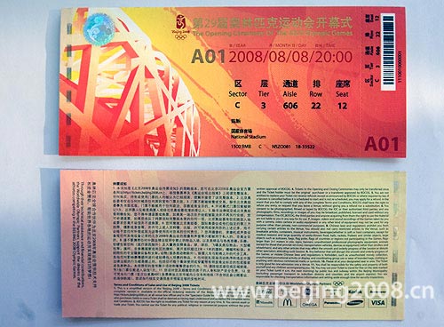 以北京奧運(yùn)會(huì)主場(chǎng)館“鳥(niǎo)巢”和祥云圖案為主要視覺(jué)元素的開(kāi)幕式門(mén)票,主題明確、色彩協(xié)調(diào)、采用了防偽技術(shù)。采用紅黃色彩,在祥云的映襯下充滿力量,色彩鮮明奪目,體現(xiàn)了開(kāi)幕式應(yīng)有的莊重與相合的慶典氣氛。