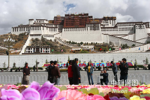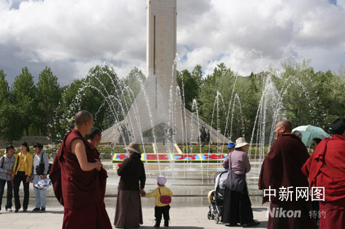 平日只在夜間開放的布達(dá)拉宮廣場音樂噴泉,今日破例在白天開放。廣場上用鮮花搭建的“民族大團(tuán)結(jié)、齊心迎奧運(yùn)”等三組奧運(yùn)主題景觀,把不是節(jié)日勝似節(jié)日的廣場裝點(diǎn)得花團(tuán)錦蔟。廣場上西藏和平解放紀(jì)念碑前,幾位紅衣喇嘛正在接受媒體采訪。日前他們曾專門舉辦過“祈愿世界和平、祝福北京奧運(yùn)”主題法會。年紀(jì)稍長的一位喇嘛說!氨本⿰W運(yùn)會圣火今天成功在珠峰點(diǎn)燃,激發(fā)了中華民族的自豪感。聽說珠峰傳遞結(jié)束后,圣火火種將在拉薩與西藏境內(nèi)傳遞的主火種會合。這又是一次民族團(tuán)結(jié)的象征,必將彰顯示中華民族傳統(tǒng)的‘和合’理念!