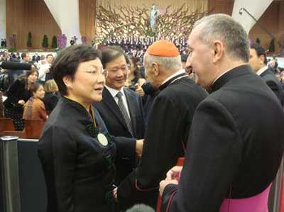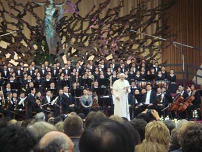 5月7日,中國(guó)愛(ài)樂(lè)樂(lè)團(tuán)及上海歌劇院合唱團(tuán)聯(lián)袂在梵蒂岡保羅六世音樂(lè)大廳舉行了專場(chǎng)演出,傾情演繹莫扎特的《安魂曲》和中國(guó)民樂(lè)《茉莉花》。演出獲得巨大成功。中方代表團(tuán)團(tuán)長(zhǎng)、中國(guó)愛(ài)樂(lè)樂(lè)團(tuán)高級(jí)顧問(wèn)鄧榕女士、中國(guó)駐意大利大使孫玉璽、使館人員、華僑華人、留學(xué)生、中資機(jī)構(gòu)代表以及教皇本篤十六世、梵、意各界近6000人欣賞了演出。
