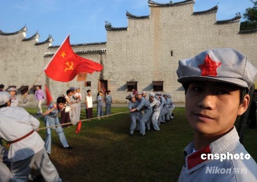 五月十四日,奧運(yùn)圣火傳遞在江西瑞金站起跑,在中華蘇維埃共和國中央政府舊址人們穿著紅軍服裝展示當(dāng)年“蘇區(qū)”體育活動。 中新社發(fā) 廖攀 攝