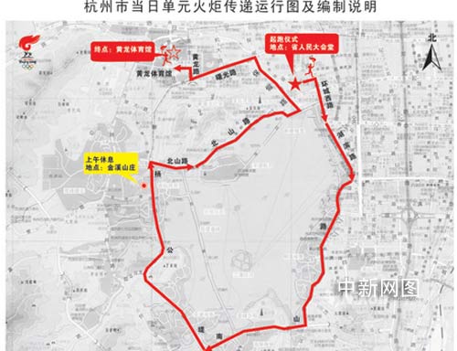 據(jù)悉,杭州段的火炬接力傳遞活動于五月十八日上午八點(diǎn)整將在浙江省人民大會堂東門外廣場舉行起跑儀式,主要環(huán)繞杭州西湖進(jìn)行傳遞,同時還將經(jīng)過雷鋒夕照、柳浪聞鶯、湖濱路名品街、西湖博覽會博物館等杭州的地標(biāo)建筑和著名景點(diǎn),最后將于十一點(diǎn)半在杭州黃龍體育館舉行奧運(yùn)火炬接力杭州站結(jié)束儀式,全程預(yù)計(jì)歷時三小時四十五分鐘,被定名為“和諧之旅——生活品質(zhì)之路”。