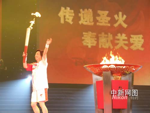 中新社杭州 5月18日電 (記者 柴燕菲 周兆軍 實(shí)習(xí)生 周翌)五月十八日上午十一點(diǎn)三十三分,杭州最后一棒火炬手、一九八四年洛杉磯奧運(yùn)會(huì)射擊冠軍吳小璇手持火炬精神抖擻跑進(jìn)杭州黃龍?bào)w育館,在她點(diǎn)燃圣火盆的同時(shí),歷時(shí)三小時(shí)四十五分鐘,總里程十五點(diǎn)六三公里的奧運(yùn)圣火杭州站傳遞活動(dòng)隨之結(jié)束。
