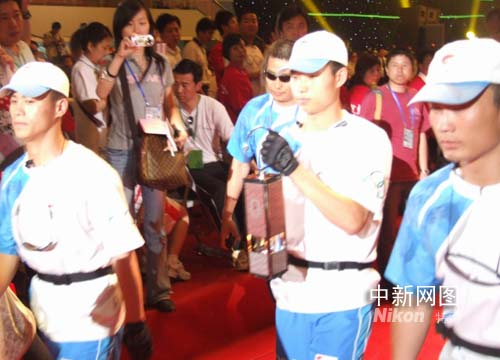 上午十一時(shí)四十二分,北京奧組委委員、教育部副部長(zhǎng)陳小亞向杭州市贈(zèng)送火炬?zhèn)鬟f城市標(biāo)志。吳小璇代表杭州兩百零八名火炬手向?yàn)?zāi)區(qū)人民捐獻(xiàn)了五十萬(wàn)三千四百十六元九角賑災(zāi)款。吳小璇告訴記者“所有的賑災(zāi)款項(xiàng)都是在家湊在一起自愿捐獻(xiàn)的,數(shù)字很真實(shí),你看,有個(gè)九毛的領(lǐng)頭出來?赡苁悄膫(gè)火炬手掏空了口袋里的錢了!