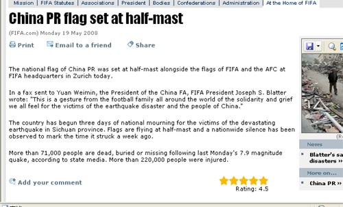 國際足聯(lián)19日在其官方網站發(fā)布了一條消息,稱國際足聯(lián)用下半旗的方式哀悼四川地震的遇難者。讓人有些遺憾的是,國際足聯(lián)主席布拉特在慰問信中,將中國足協(xié)主席的名字錯寫成“袁偉民”,而不是“劉鵬”。
