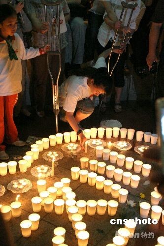 2008年5月21日,全國哀悼日的第三天,上海市政府對(duì)面的人民廣場(chǎng)上擠滿了對(duì)汶川地震遇難同胞哀悼的人群。在人群中有一位拄著拐杖的女孩,她便是奧運(yùn)火炬手金晶,在周圍人群的攙扶下,她艱難的彎下腰點(diǎn)燃蠟燭并向汶川地震遇難同胞默哀。 中新社發(fā) 俊影 攝