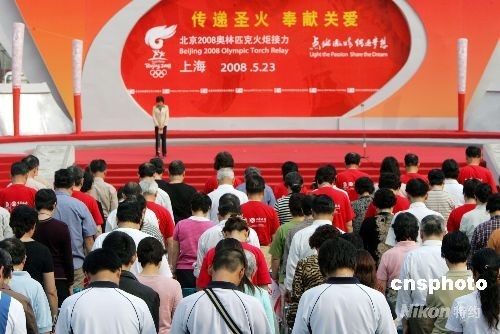 5月23日,北京奧運(yùn)圣火在上海開始傳遞。在火炬?zhèn)鬟f起跑儀式上,所有在場(chǎng)人員默哀一分鐘,向四川地震遇難者致哀。 中新社發(fā) 湯彥俊 攝