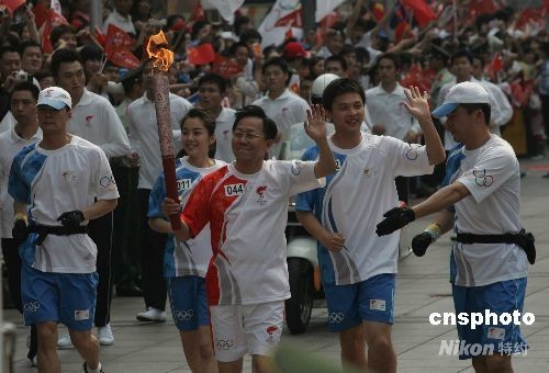 五月二十三日,中國乒乓名將姚振緒在上海繁華的南京路傳遞奧運(yùn)火炬,受到上海市民歡迎。 中新社發(fā) 潘索菲 攝