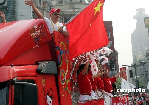 五月二十三日,奧運(yùn)圣火在上海傳遞,老外在奧運(yùn)花車(chē)上振臂為北京奧運(yùn)加油。 中新社發(fā) 潘索菲 攝