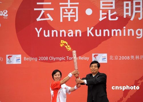 中新網(wǎng)6月9日電 北京奧運(yùn)圣火今天在云南昆明開始傳遞,起跑儀式安排在昆明世博園的中國(guó)館前的廣場(chǎng),長(zhǎng)跑名將鐘煥娣跑出第一棒。云南是奧運(yùn)火炬在中國(guó)境內(nèi)傳遞的第12個(gè)省、第二個(gè)西部省份。