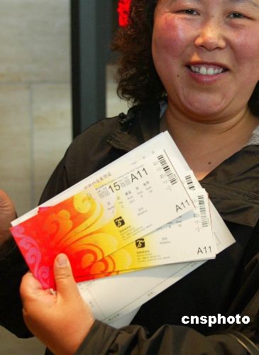 資料圖片:5月5日,北京奧運(yùn)會(huì)第三階段門票銷售正式啟動(dòng)。由于這一階段采取“先到先得”的售票原則,公眾購票熱情十分高漲。據(jù)奧運(yùn)票務(wù)中心統(tǒng)計(jì),截至當(dāng)日上午11時(shí)40分,男足半決賽和決賽、男子110米欄半決賽、男籃預(yù)賽等8個(gè)場次的門票已售罄。第三階段銷售將投放奧運(yùn)門票138萬張,涵蓋16個(gè)大項(xiàng)的244個(gè)比賽場次。圖為一位民眾買到票后異常高興。 中新社發(fā) 富田 攝
