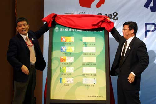 北京奧運(yùn)票務(wù)中心主任朱炎、副主任于喜來揭曉北京殘奧會門票票樣。