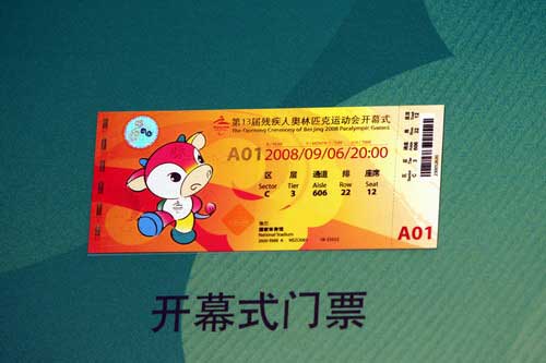 殘奧門票包括殘奧會開幕式門票、閉幕式門票、體育比賽紀(jì)念票、熱敏票,大體的方式跟奧運(yùn)會的類別是一樣的。不過,設(shè)計體現(xiàn)殘奧會的精神,開、閉幕式主要圖案是殘奧會的吉祥物,即以“福牛樂樂”為主要的元素。