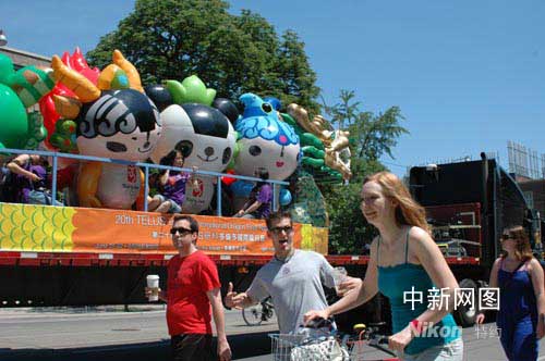中新網(wǎng)多倫多6月18日電 2008北京奧運(yùn)吉祥物“五福娃”參加第20屆多倫多國(guó)際龍舟節(jié)花車(chē)巡游,與中國(guó)傳統(tǒng)的龍舟共同傳遞來(lái)自北京奧運(yùn)的美好祝福,受到多倫多市民的熱烈歡迎。