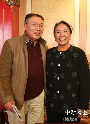 第一代著名藏族歌唱家才旦卓瑪日前接受中新社記者采訪時表示希望藏族青年一代珍惜來之不易的美好生活及大好形勢。圖為才旦卓瑪與記者合影。 賈長飛 攝影