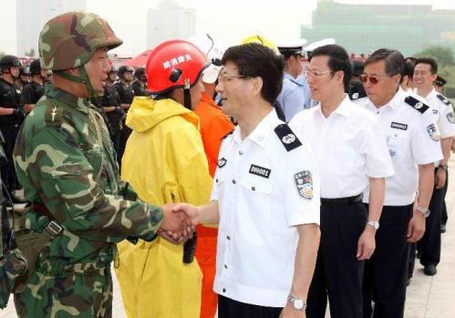 中新網(wǎng)6月25日電 據(jù)中國(guó)公安部網(wǎng)站消息,國(guó)家反恐怖教學(xué)性演習(xí)暨天津“濱海六號(hào)”演習(xí)6月24日起在天津舉行。中共中央政治局委員、天津市委書(shū)記張高麗,國(guó)務(wù)委員、公安部黨委書(shū)記、部長(zhǎng)孟建柱觀看了 “處置化學(xué)恐怖襲擊事件”的演習(xí)并實(shí)地檢查了奧運(yùn)場(chǎng)館的安全保衛(wèi)工作。