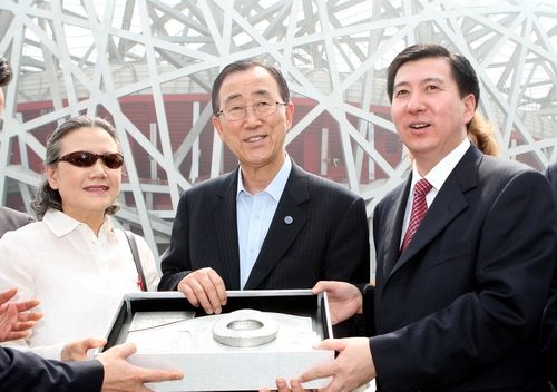 國(guó)家體育場(chǎng)運(yùn)行團(tuán)隊(duì)負(fù)責(zé)人張建東(右)向潘基文(中)及其夫人(左)贈(zèng)送“鳥(niǎo)巢”模型。