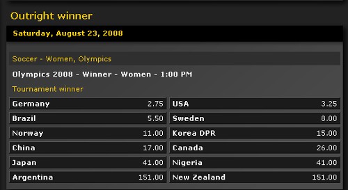 中新網(wǎng)7月10日電 北京奧運會開賽在即,足球比賽將于8月6日至23日上演。世界著名博彩公司BWIN日前分別為奧運男女足比賽開出了賠率。在男足方面,阿根廷國奧隊最被看好,BWIN開出了1:3的賠率;而女足方面,德國隊以2.75倍的賠率高居榜首。