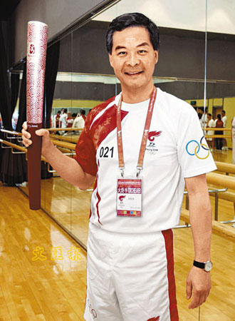 但“我跑完后,那把火炬還未曾返過我寫字樓”,原來梁振英借出奧運(yùn)火炬及火炬手制服,給一所學(xué)校拍照留念并捐款賑災(zāi)后,家長(zhǎng)教師會(huì)見狀亦趕忙向他商轉(zhuǎn)借展覽,故火炬兜兜轉(zhuǎn)轉(zhuǎn),直到9日才送回他的辦公室。