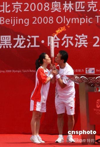 7月11日,北京奧運(yùn)火炬在“冰城”哈爾濱傳遞,火炬手著名花樣滑冰世界冠軍、“冰上情侶”申雪、趙宏博,在點(diǎn)燃圣火盆前共同深情地親吻“祥云”火炬。中新社發(fā) 周兆軍 攝