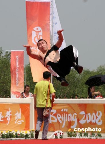 7月11日,北京奧運火炬在哈爾濱傳遞,當?shù)匚湫g(shù)運動員在傳遞結(jié)束儀式上激情獻藝。 中新社發(fā) 周兆軍 攝