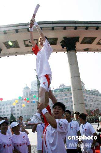 7月11日,“冰上搭檔”、花樣滑冰世界冠軍張丹、張昊在哈爾濱傳遞奧運(yùn)火炬,張昊托起張丹用高難動(dòng)作傳遞火炬。