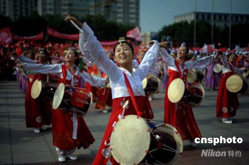 7月14日,奧運火炬在吉林長春傳遞,長春的朝鮮族姑娘舞起長鼓迎接圣火。 中新社發(fā) 廖攀 攝