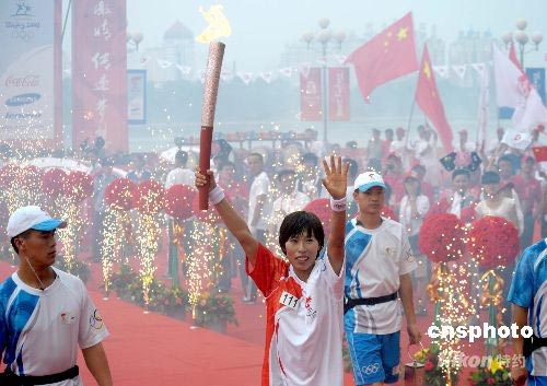 7月15日下午,奧運火炬在吉林省吉林市進行傳遞,越野滑雪運動員王春麗在熱烈的煙火歡慶中跑出火炬?zhèn)鬟f第一棒。 中新社發(fā) 廖攀 攝