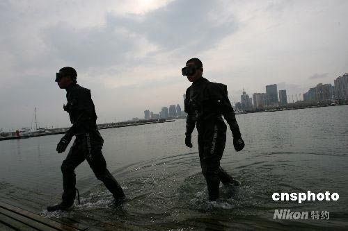 青島邊防支隊駐奧帆中心的特勤官兵暑期在奧運會帆船比賽場地進(jìn)行適應(yīng)性潛水訓(xùn)練,在貼近實戰(zhàn)狀態(tài)下提高隊員處置突發(fā)事件等能力。第29屆奧運會帆船帆板比賽將于2008年8月9日至23日在青島國際帆船中心及周邊水域舉行。中新社發(fā) 王瑤 攝