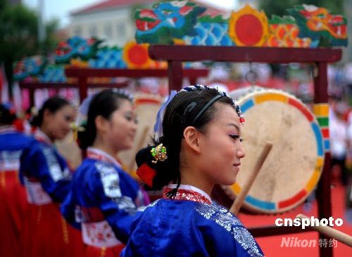 7月15日下午,奧運火炬在吉林市傳遞,朝鮮族女鼓樂手擊打鼓樂歡慶火炬?zhèn)鬟f。 中新社發(fā) 廖攀 攝