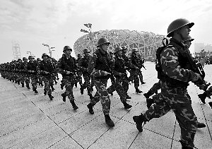 “服從命令、聽從指揮、忠于職守、英勇善戰(zhàn)……”昨日上午9時,鳥巢與水立方之間的廣場上,武警北京總隊某部1500名官兵代表緊攥右拳,向國旗和國際奧委會會旗宣誓。奧運期間,這支武警部隊將負責奧運最核心區(qū)域、賽事的警衛(wèi)及處突反恐工作,是北京賽區(qū)任務最重、用兵量最大、投入安保時間最長的部隊。