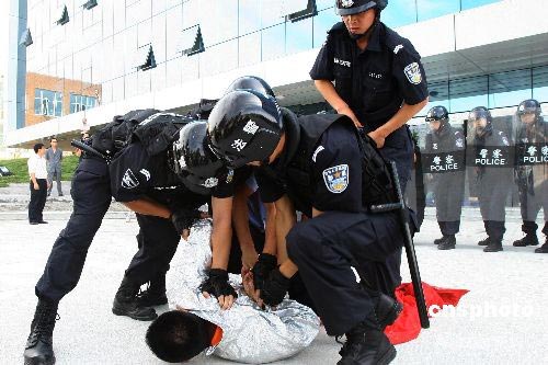 北京奧運(yùn)村法庭舉行奧運(yùn)安保演練 ,發(fā)生“突發(fā)事件”時(shí),法警控制住鬧事的“當(dāng)事人”。中新社發(fā) 劉新 攝