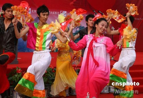 北京奧運火炬在遼寧鞍山傳遞,當(dāng)?shù)厝罕娸d歌載舞喜迎奧運火炬。 中新社發(fā) 周兆軍 攝