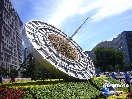 圖:日晷、渾天儀造型的奧運(yùn)花壇亮相(2)