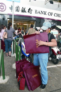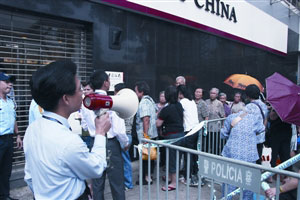 圖:澳門銀行門外有人收集奧運(yùn)鈔。(圖片來源:澳門日?qǐng)?bào))