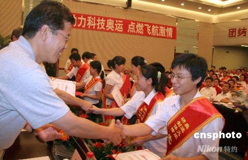 7月18日,承擔(dān)北京奧運(yùn)火炬研制任務(wù)的中國(guó)航天科工集團(tuán)第三研究院在北京舉行總結(jié)和頒獎(jiǎng)大會(huì),對(duì)該院奧運(yùn)火炬研制及技術(shù)保障團(tuán)隊(duì)進(jìn)行表彰。據(jù)悉,在借鑒火箭發(fā)動(dòng)機(jī)技術(shù)的基礎(chǔ)上,北京奧運(yùn)火炬燃燒系統(tǒng)大膽創(chuàng)新,各項(xiàng)指標(biāo)都遠(yuǎn)遠(yuǎn)超出北京奧組委設(shè)計(jì)要求,多項(xiàng)技術(shù)世界首創(chuàng),并已經(jīng)申請(qǐng)十幾項(xiàng)專利。 中新社發(fā) 孫自法 攝