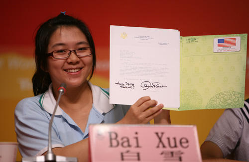 中新網(wǎng)7月21日電 一名來自北京市八一中學的普通女生白雪,受到學校一次假期作業(yè)的啟發(fā),給各國總統(tǒng)寫了宣傳北京綠色奧運的信件。目前,她已收到了包括法國總統(tǒng)薩科齊、韓國前總統(tǒng)盧武鉉、德國總理默克爾、澳大利亞前總理霍華德等元首寄回的三十余封回信。