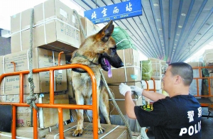 今天上午10時,記者在北京西站行李房看到,5名訓(xùn)導(dǎo)員帶領(lǐng)5條警犬對所有托運的行李進(jìn)行安全檢查。其中3名男民警帶領(lǐng)黑色和淺黃色的拉布拉多犬,而首次出場的女訓(xùn)導(dǎo)員帶領(lǐng)黃色帶棕色斑點的史賓格犬。女警們身穿黑色的警服T恤,黃色的袖標(biāo)上面印有盾牌,貼著“搜爆”標(biāo)志,女警們個個顯得英姿颯爽。一名23歲年輕漂亮的女警魯卓鼓勵了一下自己的愛犬——1歲多的搜爆犬杰瑞,發(fā)出“搜”的一聲指令,杰瑞立即順著女訓(xùn)導(dǎo)員手指的方向躥向了旁邊的一排大行李箱,努力嗅了起來。一直工作了三四十分鐘,杰瑞在行李房沒有發(fā)現(xiàn)可疑物品,又回到了魯卓的身旁。魯卓向警犬表示了友好,好好地鼓勵了它一下。