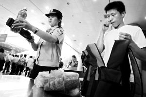昨天10時(shí)許,記者先來(lái)到北京西站進(jìn)站口,比以往更加嚴(yán)格的是,這里除了對(duì)每件行李進(jìn)行機(jī)檢外,民警還輔助用手持液體查危儀對(duì)行李中的液體進(jìn)行檢查,現(xiàn)場(chǎng)鐵警告訴記者:“如果發(fā)現(xiàn)行李中攜帶了液體,我們將會(huì)要求旅客將液體拿出,并用儀器進(jìn)一步檢測(cè)液體安全。”旅客手里拿著的瓶裝水,開(kāi)蓋的則要求當(dāng)場(chǎng)喝一口,沒(méi)有開(kāi)蓋的則也要過(guò)液體安檢儀。