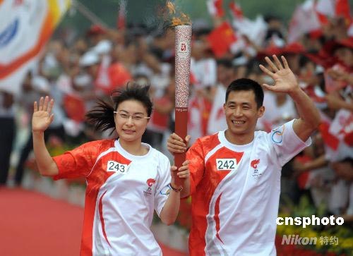 7月23日,奧運(yùn)火炬在山東濟(jì)南傳遞,中國(guó)跳水隊(duì)運(yùn)動(dòng)員、世界冠軍郭晶晶、王峰共同傳遞濟(jì)南最后一棒火炬。 中新社發(fā) 廖攀 攝