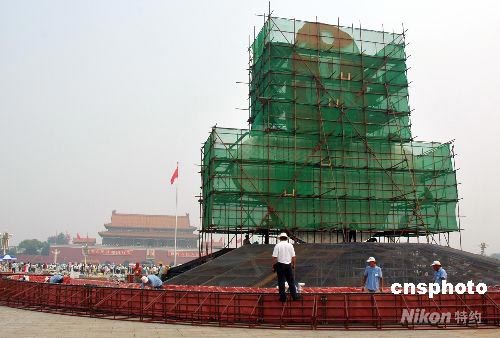 北京天安門廣場中央“中國印·舞動的北京”奧運會會徽花壇與噴泉水池正在建立之中。其中“中國印”為LED光源燈箱,可以旋轉(zhuǎn),整個廣場花壇都采用了夜景照明設(shè)計,達到白天看花,晚上看燈的效果。中新社發(fā) 張雙雙 攝