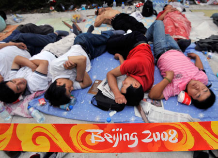 從昨天下午1點開始,已有人趕到朝陽區(qū)北土城東路奧體中心售票處等待購買25日才開售的最后一批奧運門票。至昨晚11點,已有300余人趕到排隊,且隊伍仍在不斷擴大。