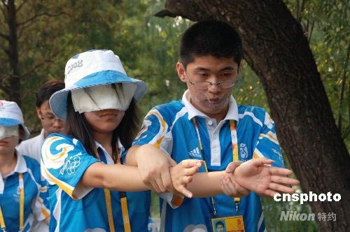 7月23日,北京2008奧林匹克青年營里的志愿者正在進行信任度培訓(xùn)。該培訓(xùn)由兩個人進行配合,一個人把眼睛蒙住、一個人把嘴巴封住,完全靠對方的身體語言進行溝通,該培訓(xùn)將有助于志愿者對奧林匹克青年營里首次招募的殘疾人營員進行幫助。 中新社發(fā) 王東明 攝