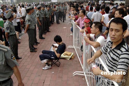 7月25日上午9時(shí),第4階段奧運(yùn)門票銷售正式開始,北京五棵松籃球體育館外排隊(duì)數(shù)日的數(shù)千球迷在安保人員的指揮下有序入場(chǎng)購(gòu)買。 中新社發(fā) 徐曦弋 攝