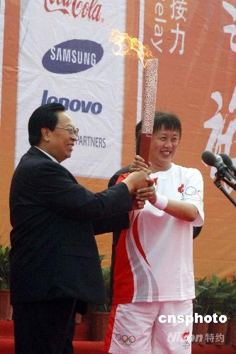 7月25日,原中國(guó)女排奧運(yùn)冠軍、國(guó)家體育總局排球運(yùn)動(dòng)管理中心書(shū)記、副主任張蓉芳作為鄭州奧運(yùn)火炬?zhèn)鬟f首棒火炬手,從河南省委書(shū)記徐光春手中接過(guò)奧運(yùn)火炬。 中新社發(fā) 慎重 攝