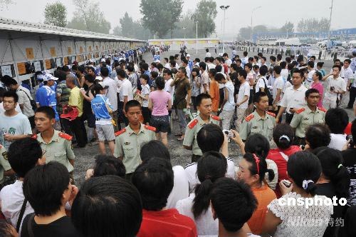 7月25日上午9點(diǎn),最后82萬(wàn)張北京奧運(yùn)會(huì)比賽門(mén)票開(kāi)始銷售。銷售現(xiàn)場(chǎng)異;鸨,購(gòu)買(mǎi)門(mén)票的群眾分批進(jìn)入等候,武警官兵一字排開(kāi)維持現(xiàn)場(chǎng)秩序。中新社發(fā) 王宇婷 攝