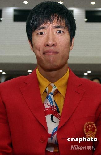 7月25日,參加北京奧運(yùn)會(huì)的中國(guó)體育代表團(tuán)在北京正式成立,長(zhǎng)期封閉訓(xùn)練難得露面的劉翔穿上代表團(tuán)的全套正裝神態(tài)輕松,不改頑皮活潑的本性。 中新社發(fā) 任晨鳴 攝