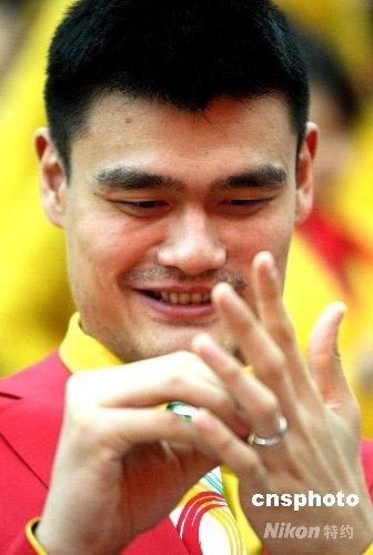 7月25日,參加北京奧運(yùn)會的中國體育代表團(tuán)在北京正式成立。中國男籃的“擎天柱”姚明為了報效祖國將暫時與愛妻葉莉“分居 ”,全力備戰(zhàn)。中新社發(fā) 任晨鳴 攝
