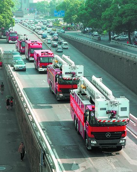 長(zhǎng)沙最先進(jìn)的消防車(chē)隊(duì)正通過(guò)袁家?guī)X路段。